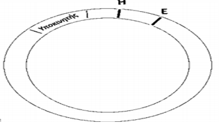 11. Γονιδιωματική βιβλιοθήκη είναι ένα: 14. Κλωνοποιημένο cDNA που προέρχεται από το mRNA της β αλυσίδας της αιμοσφαιρίνης Α, μπορεί να οδηγήσει τη σύνθεση σωστού και ολοκληρωμένου πεπτιδίου στο βακτήριο Ε.coli, ενώ το αντίστοιχο κλωνοποιημένο χρωμοσωμικό γονίδιο δεν μπορεί, επειδή: 22. Ένας πλασμιδιακός φορέας κλωνοποίησης χρησιμοποιείται για τη μεταφορά ενός γραμμικού δίκλωνου τμήματος DNA σε βακτηριακά κύτταρα. Οι θέσεις αναγνώρισης δύο περιοριστικών ενδονουκλεασών, των HindIII και ΕcoRI, φαίνονται στην εικόνα με τα αναγνωριστικά Η και Ε αντίστοιχα. Η HindIII αναγνωρίζει την παρακάτω αλληλουχία και σπάει τους φωσφοδιεστερικούς δεσμούς ανάμεσα στα νουκλεοτίδια με αζωτούχο βάση την Αδενίνη και στους δύο κλώνους. Το πλασμίδιο ανασυνδυάζεται αφού σε αυτό επιδράσουν και οι δύο περιοριστικές ενδονουκλεάσες. Το δίκλωνο DNA που θα μπορούσε να εκφραστεί με επιτυχία στα βακτήρια μετά τη μεταφορά του με φορέα το συγκεκριμένο πλασμίδιο είναι το:5’ -AAGCTT-3’