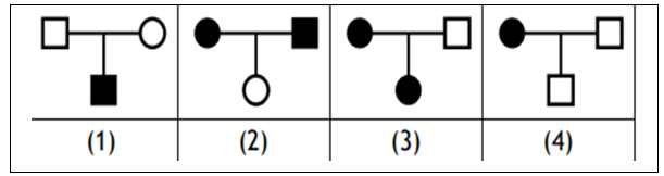 7. Από διασταύρωση δύο ατόμων Drosophila προέκυψαν: 303 άτομα με γκρι χρώμα και κανονικά φτερά, 99 άτομα με μαύρο χρώμα και κανονικά φτερά, 102 άτομα με μαύρο χρώμα και ατροφικά φτερά και 297 άτομα με γκρι χρώμα και ατροφικά φτερά. Τα γονίδια βρίσκονται σε διαφορετικά χρωμοσώματα 10. Η μελέτη των γενεαλογικών δέντρων όπως είναι γνωστό βοηθά στην διαπίστωση του τρόπου που κληρονομείται μία ασθένεια. Ο αποκλεισμός του τρόπου κληρονομικότητας μιας ασθένειας μπορεί να γίνει από μελέτη συγκεκριμένων διασταυρώσεων, οι οποίες είναι ικανές να δώσουν την πληροφορία. Παρακάτω φαίνονται τέσσερα γενεαλογικά δέντρα όπου οι φαινότυποι των ατόμων εμφανίζουν διαφορετική κληρονομική ασθένεια. Ποιο τρόπο κληρονομικότητας αποκλείει κάθε ένα από τα τέσσερα δέντρα;