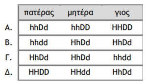 17. Από διασταύρωση ατόμων Drosophila γεννήθηκαν 201 θηλυκά και 100 αρσενικά. Αυτό εξηγείται ως εξής: 18. Στο πλαίσιο της μεντελικής θεώρησης να επιλέξετε την σωστή πρόταση: 30. Ο Περικλής και η Ασπασία απέκτησαν το πρώτο στους παιδί, τον Κυριάκο, με ομάδα αίματος Ο και Ρέζους θετικό. Η Ασπασία γνωρίζει ότι έχει αίμα ομάδας Α και Ρέζους αρνητικό. Ο Περικλής δε γνωρίζει τη δική του ομάδα αίματος παρά μόνο ότι η μητέρα του και ο πατέρας του έχουν αίμα ομάδας Β και Ρέζους θετικό. Ο Περικλής και η Ασπασία δεν μπορούν να εξηγήσουν την ομάδα αίματος και τον παράγοντα Ρέζους του παιδιού τους. Ο παράγων Ρέζους είναι μονογονιδιακός χαρακτήρας, κληρονομείται με αυτοσωμικό τρόπο και η παρουσία του οφείλεται σε επικρατές γονίδιο. Ποια από τις παρακάτω προτάσεις είναι η καλύτερη εξήγηση; 34. Η γονοτυπική αναλογία και η φαινοτυπική αναλογία ταυτίζονται: