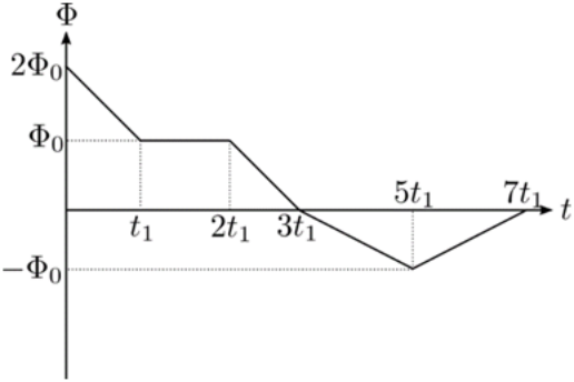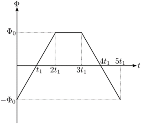 1. Μεταλλικό πλαίσιο βρίσκεται ακίνητο μέσα σε ομογενές μαγνητικό πεδίο κάθετα στις δυναμικές γραμμές του. Στο παρακάτω διάγραμμα φαίνεται η μεταβολή της μαγνητικής ροής του πλαισίου σε συνάρτηση με το χρόνο. Ποιες απ’ τις παρακάτω προτάσεις είναι σωστές;