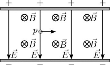 27. Θετικά φορτισμένα σωματίδια μάζας \[m\] και φορτίου \[q\] επιταχύνονται απ’ την ηρεμία υπό τάση \[V\] και κατόπιν εισέρχονται σε φίλτρο ταχυτήτων μαγνητικού πεδίου έντασης \[ \vec{B} \] και ηλεκτρικού πεδίου έντασης \[\vec{E}\] όπως φαίνεται στο παρακάτω σχήμα. Αν τετραπλασιάσουμε την τάση που επιταχύνει το φορτίο τότε για να μην εκτραπεί της αρχικής του πορείας από το φίλτρο ταχυτήτων πρέπει: