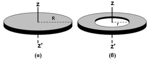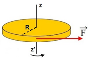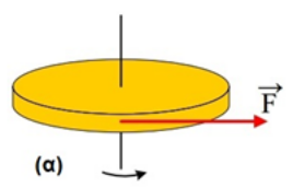 24. Δίσκος εκτελεί στροφική κίνηση γύρω από σταθερό κατακόρυφο άξονα που είναι κάθετος στις βάσεις του και διέρχεται απ’ τα κέντρα τους. Η γωνία που διαγράφει ο δίσκος με το χρόνο δίνεται απ’ τη σχέση \[θ=10t\] (S.I.). Ποιες από τις παρακάτω προτάσεις είναι σωστές;